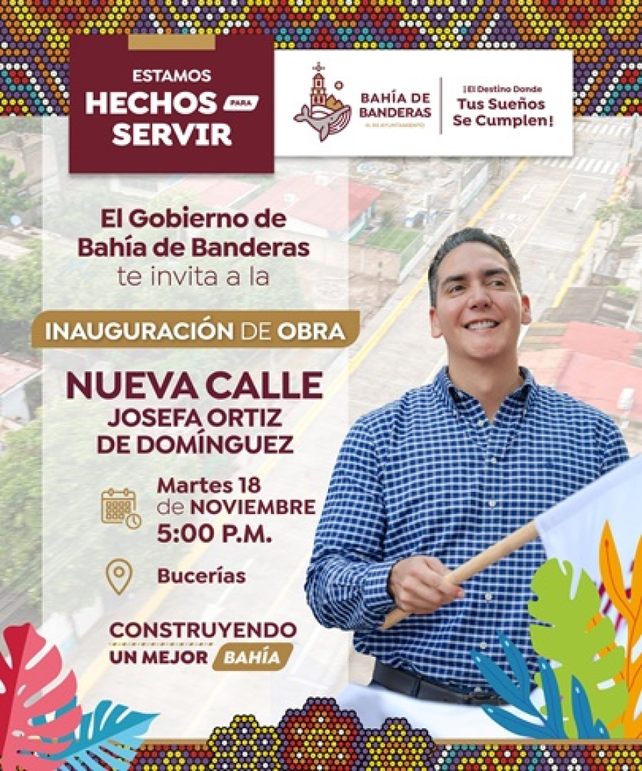 Escrito por La RedacciónEl Gobierno de Bahía de Banderas, que encabeza el presidente municipal Héctor Santana, invita a la ciudadanía a participar en la inauguración de la nueva calle Josefa Ortiz de Domínguez, que se llevará a cabo el día de mañana martes 18 de noviembre en punto de las 5:00 de la tarde.