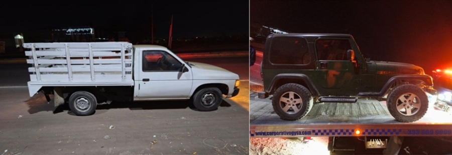 Agentes investigadores se trasladaron al lugar donde confirmaron el hallazgo. Los vehículos asegurados son un Jeep Wrangler 2006, en color verde, con placas de Jalisco y una camioneta de carga Nissan Estacas, modelo 1998, en color blanco, también con placas del Estado.
