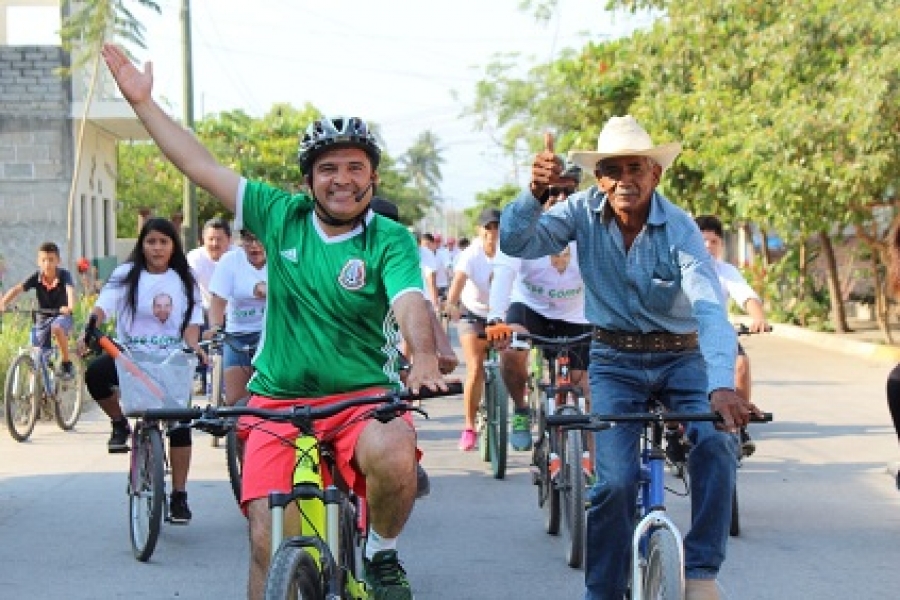 Bahía de Banderas, Nayarit.- Luego de realizar intensos recorridos por distintas poblaciones de este municipio que concluyó con un exitoso paseo ciclista, el candidato del PRI a diputado federal, José Gómez, refirió que el trabajo honesto y responsable que ha hecho a lo largo de su trayectoria como funcionario público y empresario, lo están catapultando al triunfo electoral del primero de julio próximo.